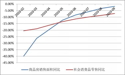 居民中長期貸款刷新記錄,自然與房價和銷售面積的增長密切相關。今年前三季度,全國商品房累計銷售面積11.71億平米,同比下降1.8%,降幅連續(xù)7個月收窄,年底增速轉(zhuǎn)正基本沒有懸念。疫情下不許集聚,售樓處關閉了近半年,但是商品房銷售面積居然要硬生生“轉(zhuǎn)正”了,只能說房地產(chǎn)韌性太強。要知道,疫情后商品房市場受到的沖擊,比普通居民消費受到的沖擊大得多。一季度,商品房銷售面積同比下跌26.3%,而社會消費品零售總額下跌了19%。但是,5月份開始,二者的走勢開始分化了,到了9月份,商品房銷售馬上浮出“水面”了,而全國社會消費品零售總額累計同比下跌仍達7.2%。