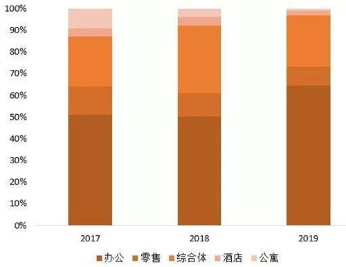 由于穩(wěn)定的回報和資產(chǎn)管理模式,辦公樓向來是全國大宗交易市場最主要的投資標(biāo)的。根據(jù)高力國際數(shù)據(jù),2019年全國辦公項目成交金額占總交易額的67%。酒店、公寓、零售、綜合體類交易占比有所下降。在不確定性大的環(huán)境下,投資人仍然偏好帶來穩(wěn)定現(xiàn)金流、且運營相較其他業(yè)態(tài)成熟的辦公樓。