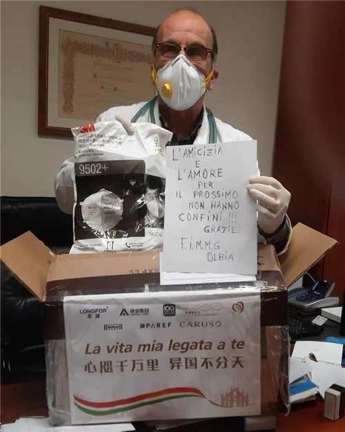來自意大利撒丁島的Giovanni 醫(yī)生收到了復(fù)星援助意大利的口罩。