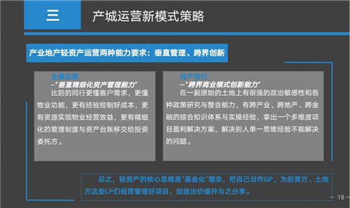 產(chǎn)城業(yè)務(wù)也有兩種運(yùn)作的方法,一是全景運(yùn)營,這是我們提出來的一種新理念,也就是說把產(chǎn)城項(xiàng)目垂直精細(xì)化的資產(chǎn)管理能力發(fā)揮到淋漓盡致。這就要求我們產(chǎn)城運(yùn)營商要非常了解客戶的需求,以及項(xiàng)目本身所承載的功能,使項(xiàng)目通過非常精細(xì)化的投資、建設(shè)、運(yùn)營管理獲得專業(yè)能力帶來的收益與溢價。二是地產(chǎn)投行,就是跨界商業(yè)模式的創(chuàng)新能力。也就是說在產(chǎn)城項(xiàng)目上,我們能夠跨產(chǎn)業(yè)、跨地產(chǎn)、跨金融尋找出一個新的解決方案,能夠使政府、入園企業(yè)、投資商、以及我們運(yùn)營商能夠拿到大家都想得到的合理的收益。這種商業(yè)模式其實(shí)是最難的、最高的但是收益也是最大的。